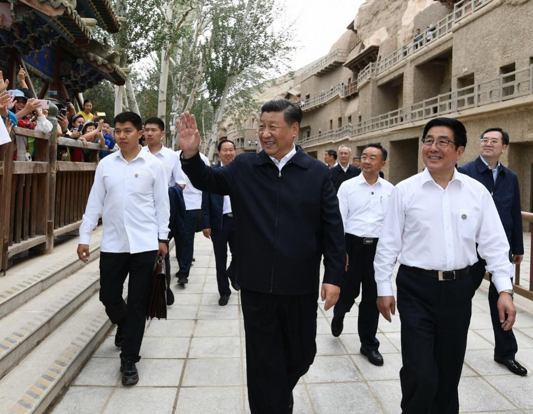 819日下午,习近平在敦煌莫高窟考察调研时,向正在参观的游客亲切招手致意。