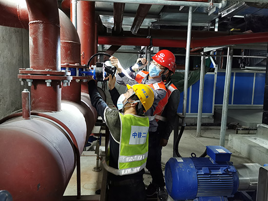 中铁二局集团复工复产工作正根据项目所在地实际情况有序、加紧推进。图为工人正在为深圳地铁某站冷水机房调试。(受访者供图)