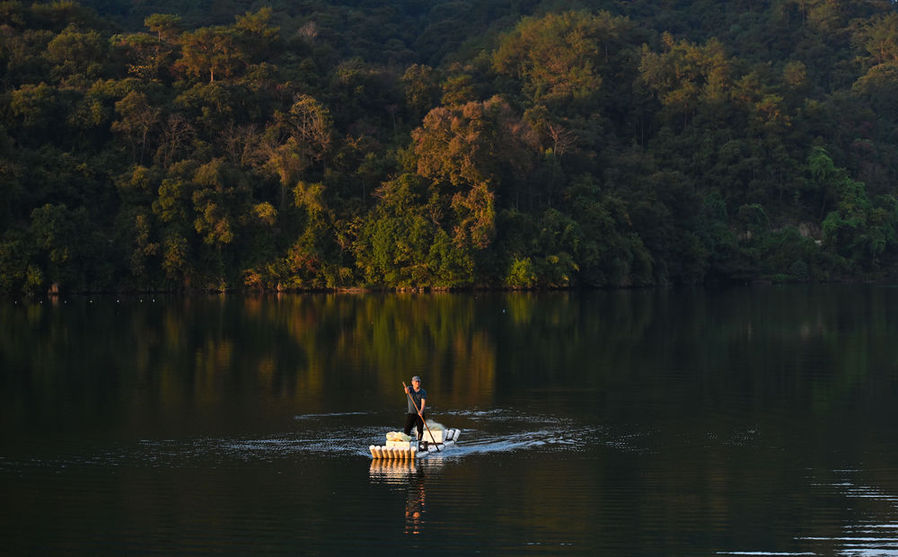 1120日,常口村村民在村旁的金溪上划船。 新华社记者 宋为伟 摄