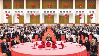 人民大会堂宴会厅灯光璀璨、暖意融融,各界人士约1000人欢聚一堂、共迎新春,欢声笑语间洋溢着喜庆祥和的节日气氛。
