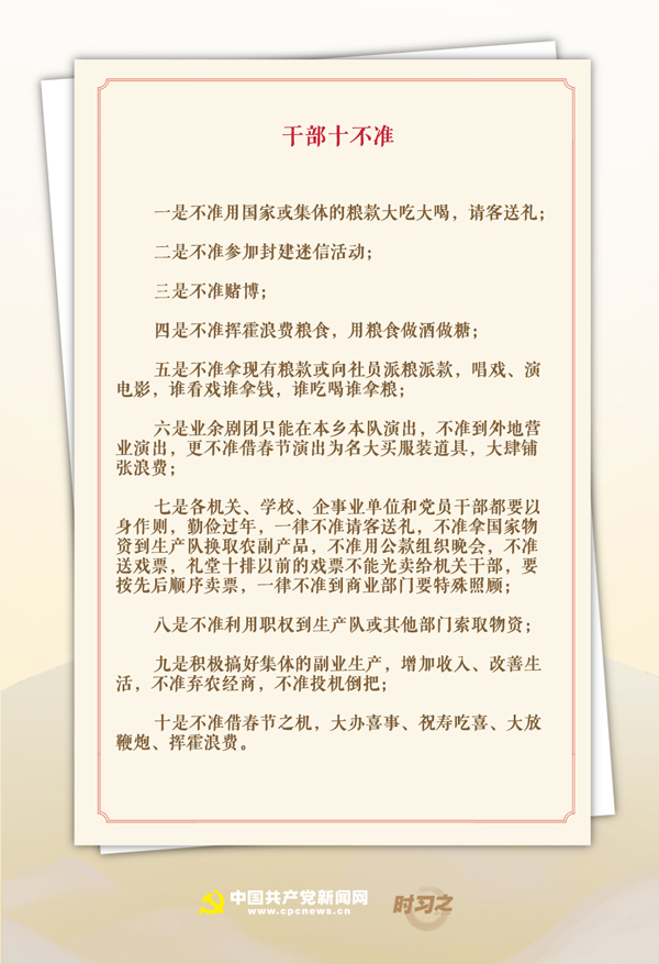 不准用国家或集体的粮款或其他物资大吃大喝,请客送礼;一律不准到商业部门、合作社部门要特殊照顾;不准借春节之机,大办喜事,做寿吃喜,大放鞭炮,挥霍浪费……1963年春节期间,焦裕禄起草了“十不准”。