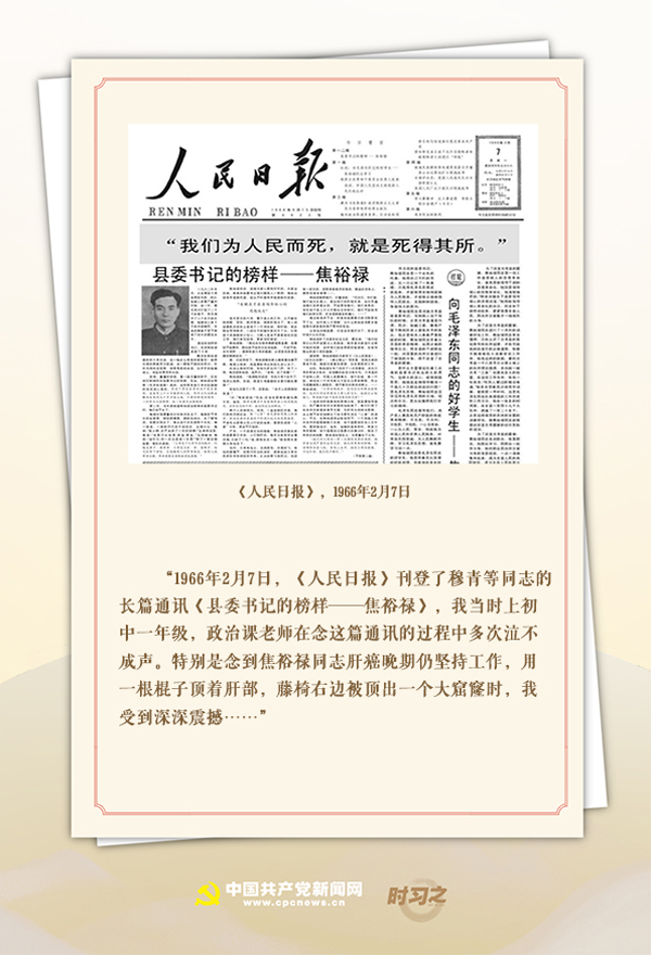 1966年2月7日,《人民日报》头版位置刊登了新华社记者的长篇通讯《县委书记的榜样——焦裕禄》。谈起这段往事,习近平曾说:“我当时上初中一年级,政治课老师在念这篇通讯的过程中多次泣不成声。特别是念到焦裕禄同志肝癌晚期仍坚持工作,用一根棍子顶着肝部,藤椅右边被顶出一个大窟窿时,我受到深深震撼……”。