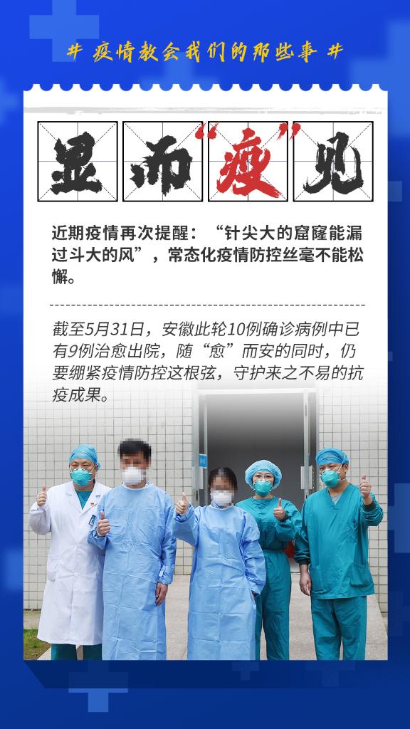 截至531日,安徽省中风险地区由高峰期的7个陆续降低为1个。在经历了半个多月的疫情防控考验后,安徽本轮新冠肺炎疫情得到有效控制。