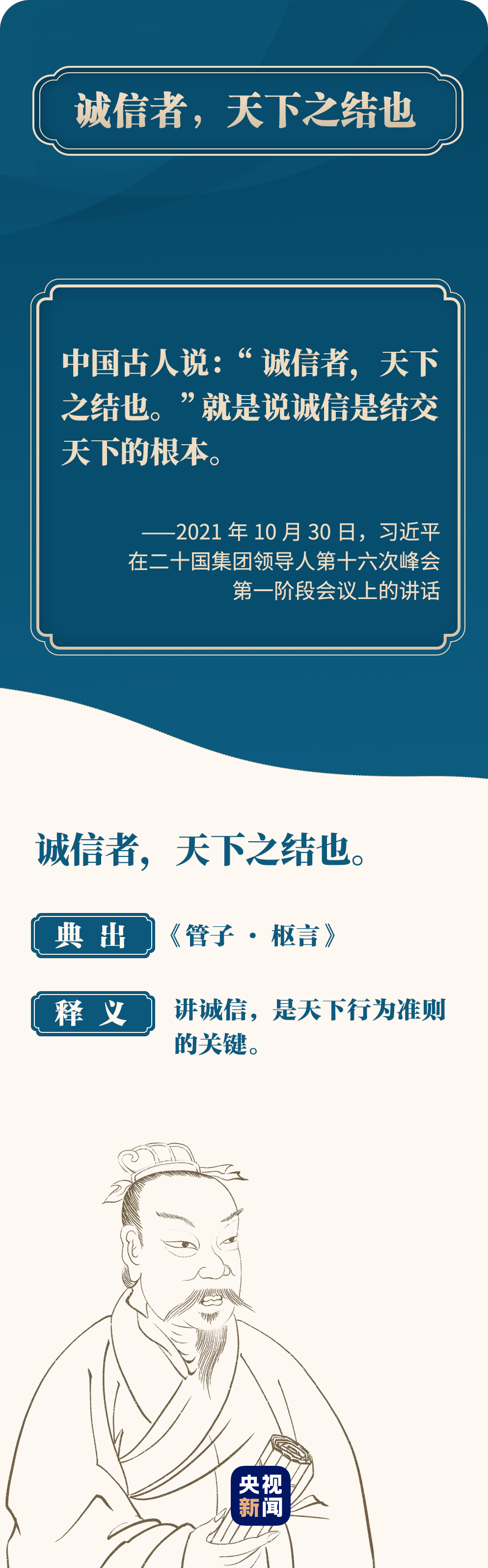 “中国古人说:‘诚信者,天下之结也。’”在1030日的讲话中,习近平主席引用中国古语,深刻阐述了中国坚持对外开放的基本国策和以诚信结交天下的中国态度。