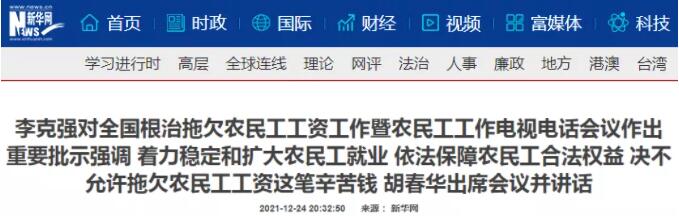 据新华社北京1224日电 全国根治拖欠农民工工资工作暨农民工工作电视电话会议1224日在京召开。中共中央政治局常委、国务院总理李克强作出重要批示。