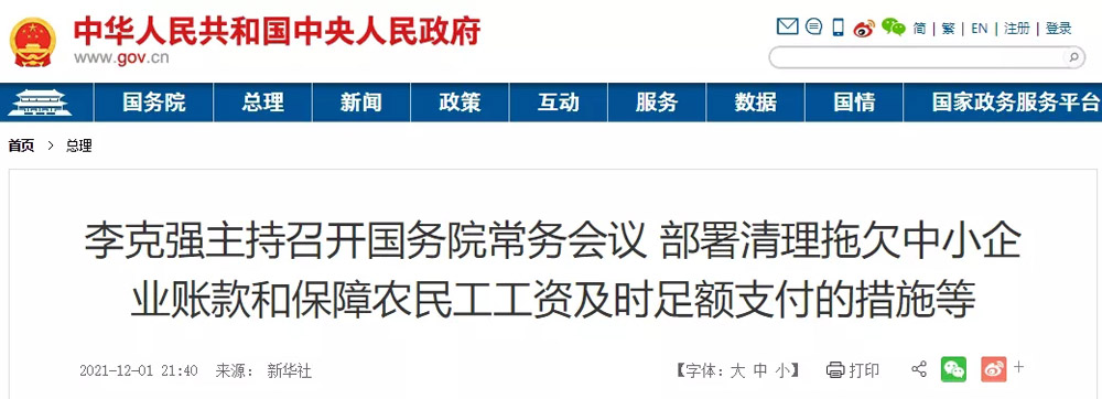 121日,国务院总理李克强主持召开国务院常务会议 部署清理拖欠中小企业账款和保障农民工工资及时足额支付的措施等。
