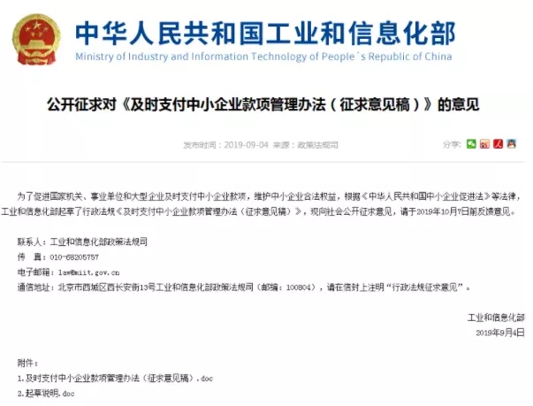 20219月,工业和信息化部中小企业局对《保障中小企业款项支付投诉处理办法(暂行)》公开征求意见。
