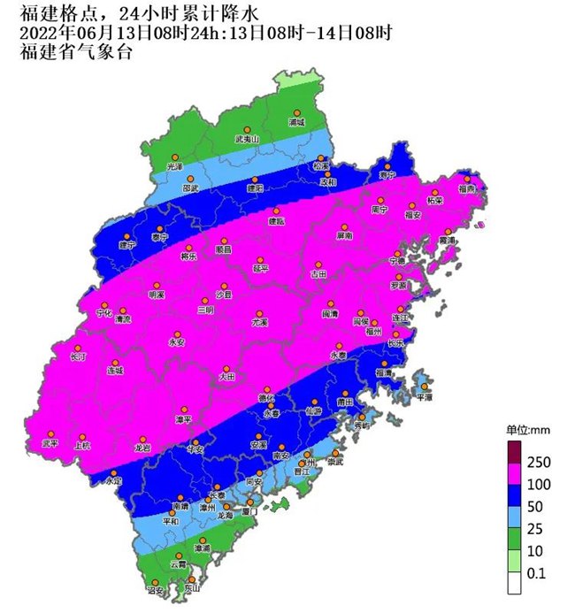 人民网福州6月13日电 (钱嘉禾)据福建省人民政府防汛抗旱指挥部(以下简称省防指)消息,13日11时,福建防汛、气象部门会商研判:13日,龙岩、三明、宁德、福州大部、南平(延平、顺昌、建瓯、邵武、建阳、松溪、政和)、莆田(涵江、仙游)、泉州(德化、永春、安溪)、漳州(华安)有暴雨到大暴雨。24小时雨量60~150毫米,局部可达220毫米,最大小时雨量100毫米。福建省防指维持防暴雨Ⅲ级应急响应。