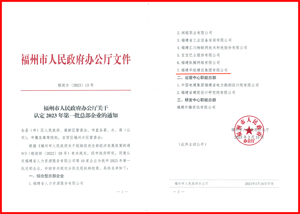 近日,福州市2023年第一批总部企业名单正式发布,开云游戏被认定为“福州市综合型总部企业”。“总部企业”是福州市人民政府对各个领域具有优势地位、发展潜力以及总部集聚效应显著企业的认证。被认定为福州市的“总部企业”,是华航集团在打造建筑强企的发展道路上,取得的又一项重要荣誉。